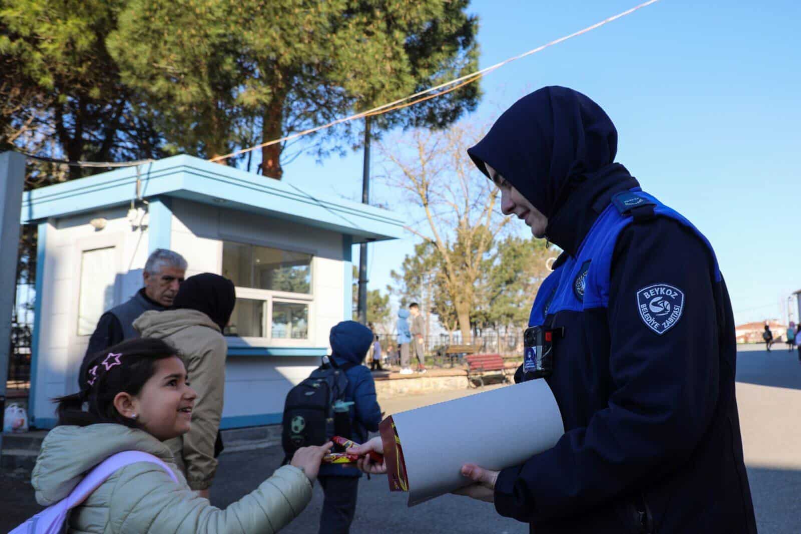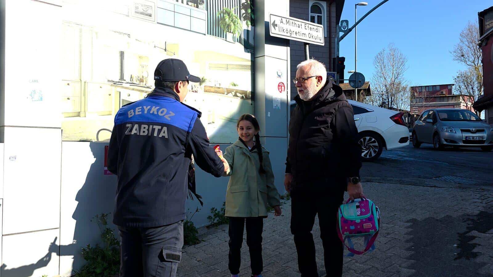 Beykoz Belediyesi Zabıta Müdürlüğü ekipleri, okul giriş ve çıkış saatlerinde denetimlerini artırdı. Trafiğin düzenlenmesinden şüpheli durumlara müdahaleye kadar geniş kapsamlı görevler üstlenen ekipler, öğrencilere çikolata ikram ederek de moral desteği sağladı.