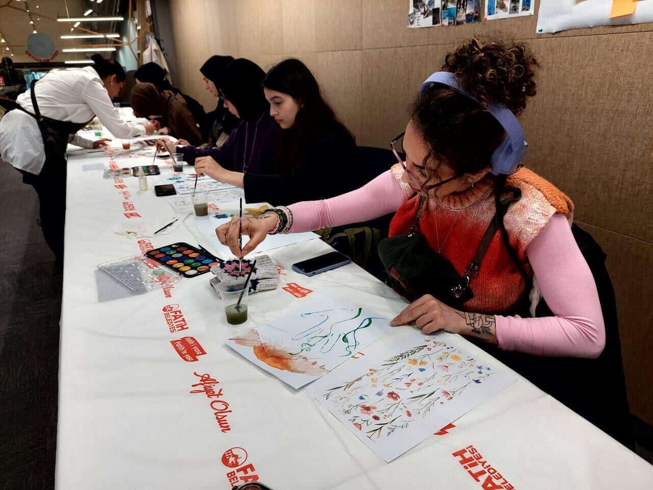 Daha sonra, sulu boya tekniğinin püf noktaları üzerinde duruldu. Renk katmanlama, ton farklarının elde edilmesi ve fırça kullanımı gibi başlıklar adım adım uygulandı. Katılımcılar, suyun miktarını kontrol ederek açık ve koyu tonlar oluşturmayı deneyimledi.